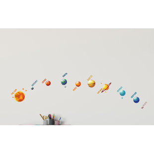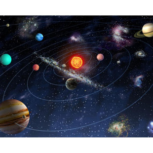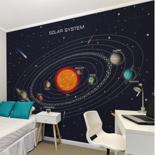 Discover the planets with this Solar System mural. With their orbits outlined and each planet named, you'll know the solar system better than anyone. Solar System mural measures 9ft 10 in x 7 ft 10 in when assembled. Solar System Wall Mural comes on 6 panels.