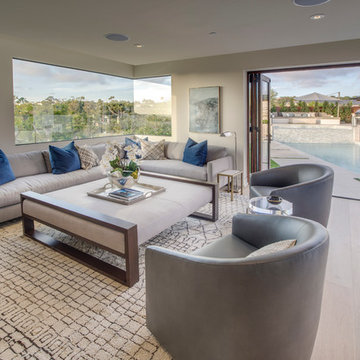 Family room - large contemporary open concept light wood floor family room idea in Orange County with white walls, no fireplace and no tv